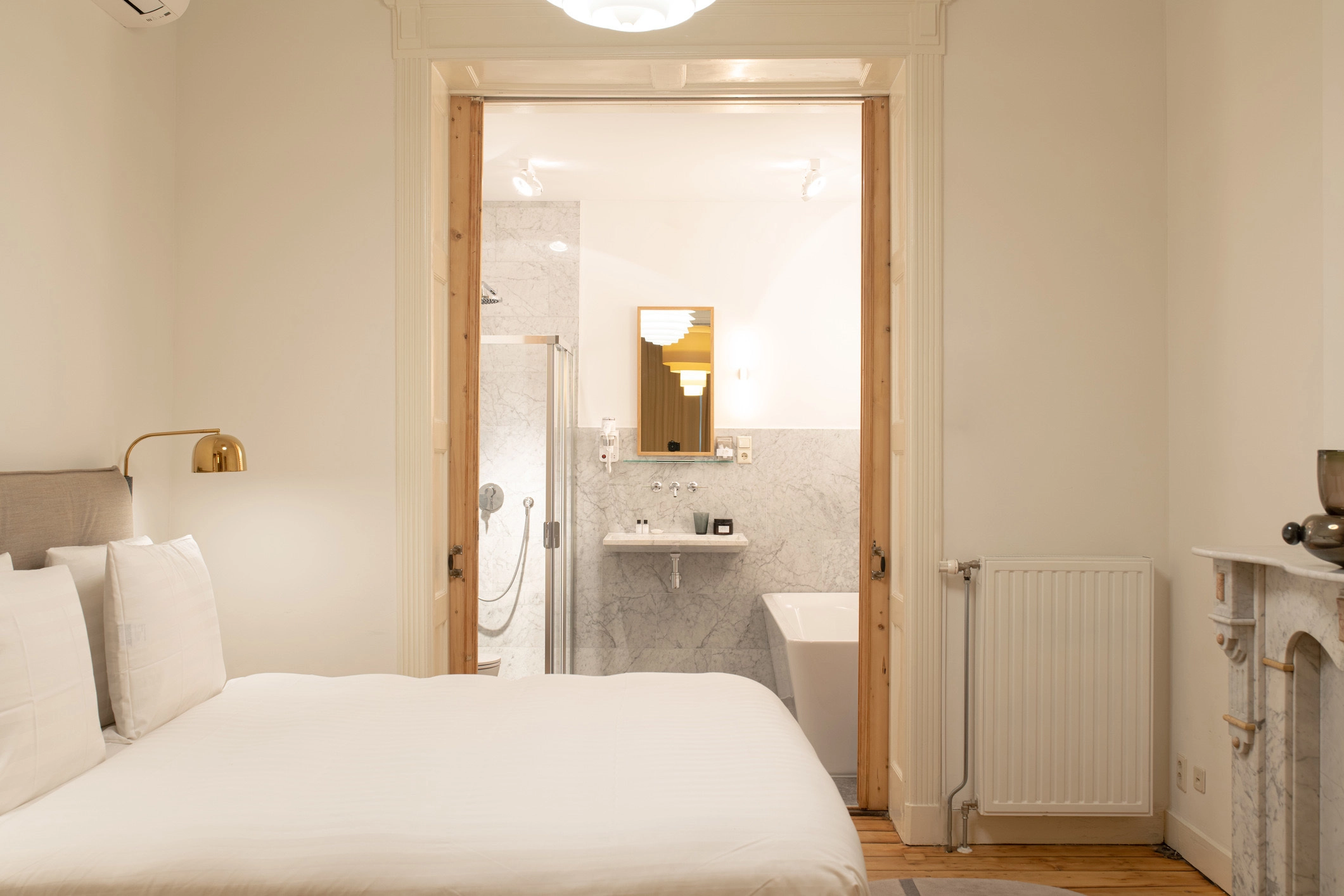 This spacious deluxe suite features a lounge area with a view of the Vrijthof and a king-size Auping bed. The en-suite marble bathroom offers a delightful bathing experience with a bathtub and a walk-in rain shower.