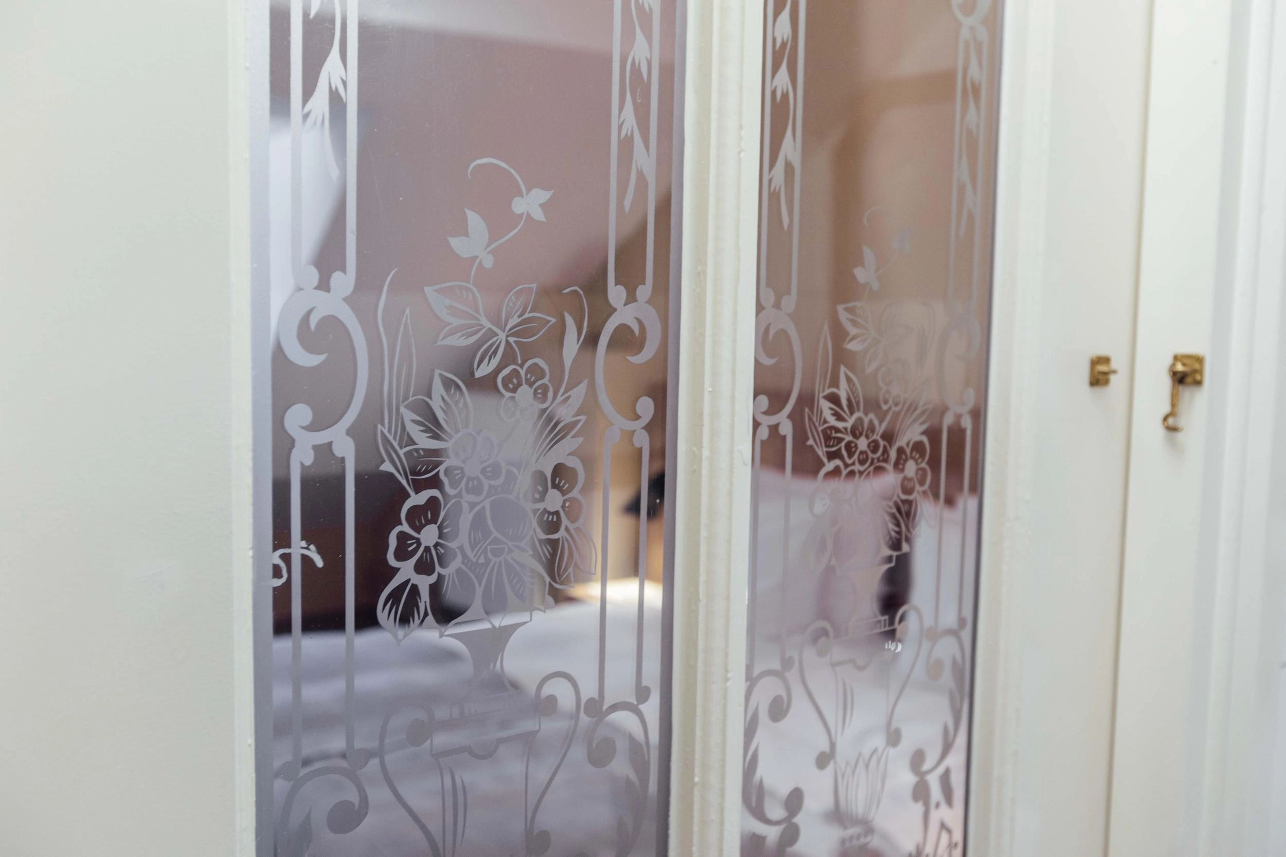 This spacious room, featuring authentic glass and wooden doors, is situated on the rooftop of Maison Haas and offers a peaceful retreat during your stay. It features a comfortable sofa, a desk, and a bathroom with a walk-in rain shower. The room is only accessible via a steep staircase.